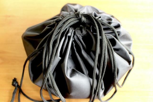 広げた状態で使ったあと、紐をひっぱっていくと巾着に。