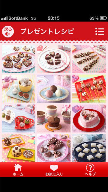 レシピは、スイーツの種類、食べるシーン、材料などから検索可能。