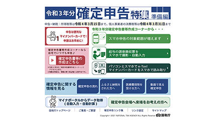 国税庁は、特設サイト「令和3年分 確定申告特集(準備編)」をオープンした。お知らせ、関連情報、説明動画などを公開している。2022年1月上旬に更新し、正式オープンする。