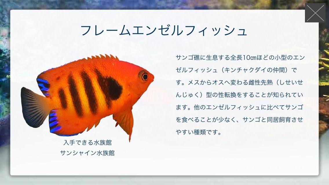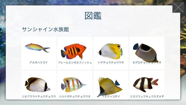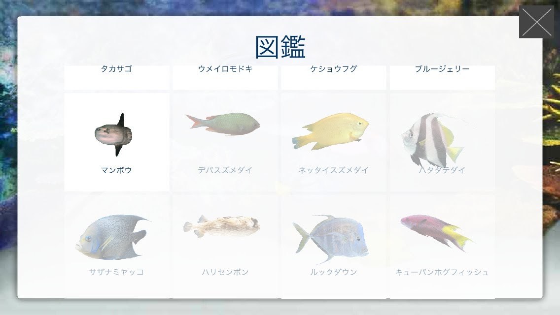 Ikesuの「図鑑」を見てみると、ゲットした魚一覧を確認できます。それぞれタップすれば、詳細な情報を見ることが可能です。まだゲットしていない魚はグレーアウトしています。水族館内を歩きまわってコンプリートを目指しましょう。