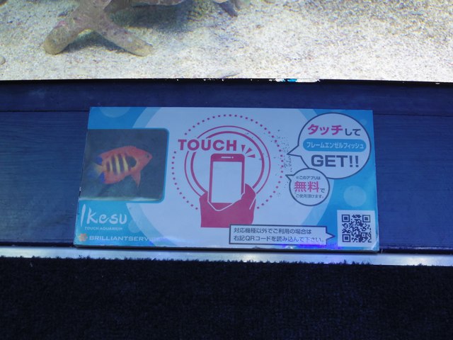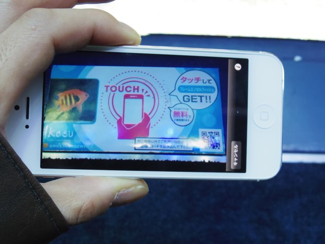 水槽の前を見てみると、Ikesu用のタグを発見! NFCに対応したスマホを使っている場合は、このタグ上にスマホをかざせばお魚をゲットできます。僕はiPhone 5なので、アプリからQRコード読み取り機能を起動し、QRコードを撮影しました。