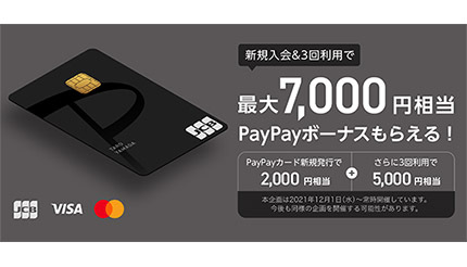 PayPayカードは、最大7000円相当のPayPayボーナスがもらえる新規入会キャンペーンを実施している。入会特典PayPayボーナス2000円相当は審査完了後、即時付与する。つまり審査が通れば条件なしに受け取れる。