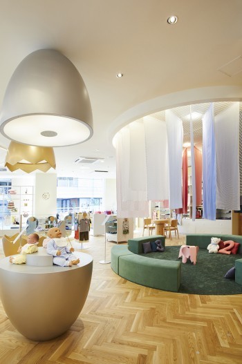 モノコトマナビの体感型ショップ。1階では出産準備のアイテムから160cmまでのファッションアイテムが揃います。