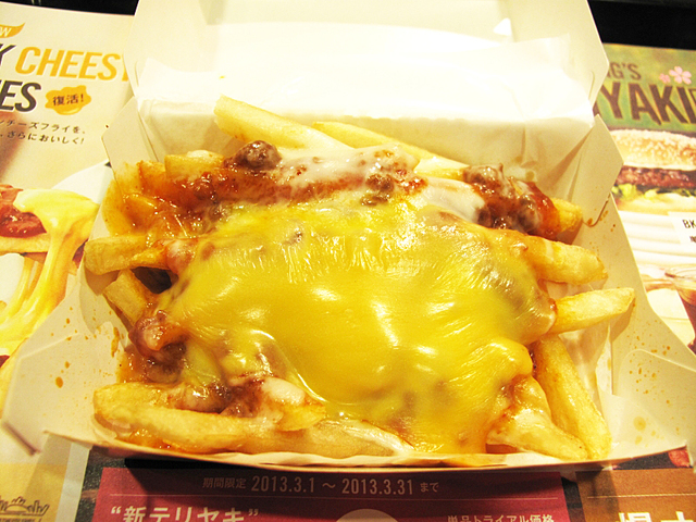 さらに今回は、3月1日から販売開始した新サイドメニュー『BK チージーフライ』も食べてみました。2年前に期間限定で発売された『アメリカンチーズフライ』がグランドメニュー化されたもので、フレンチフライの上にオリジナルのミートソース、そしてチェダー・モントレージャックの2種類のチーズをかけた一品です。