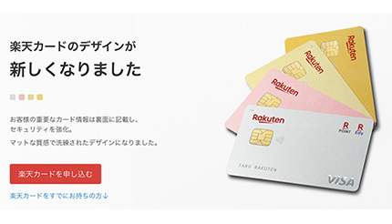 楽天カードは、デザインカードを除き、カードデザインを一新。11月25日以降の新規・2枚目の申込の場合、カード表面に氏名・番号などのカード情報の記載のないナンバーレス仕様の新デザインとなる。国際ブランドは、Visa/Mastercard/JCB/アメリカン・エキスプレスから選択でき、「Visaのタッチ決済」に比べ、対応カードが少なかった「JCBのタッチ決済」対応の有力なカードが登場した。
