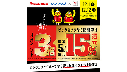 NTTドコモは「ビックカメラ_dポイント3倍キャンペーン!」を12月12日まで実施している。また12月11日から12月31日まで「コジマ dポイント20倍キャンペーン!」を実施する。