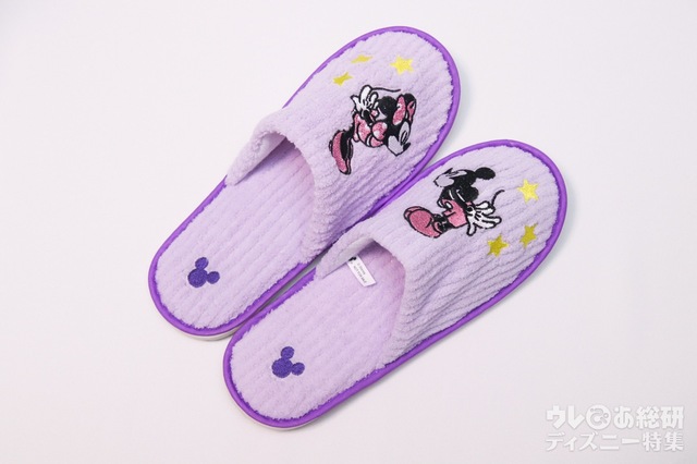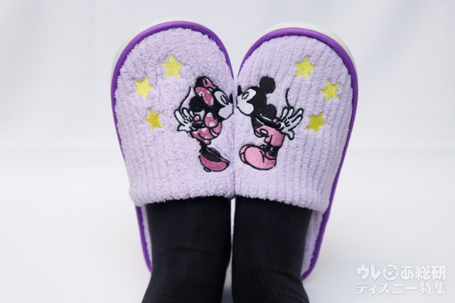 ミッキー&ミニーのラブラブな刺繍が施されたパープルカラーのスリッパ。