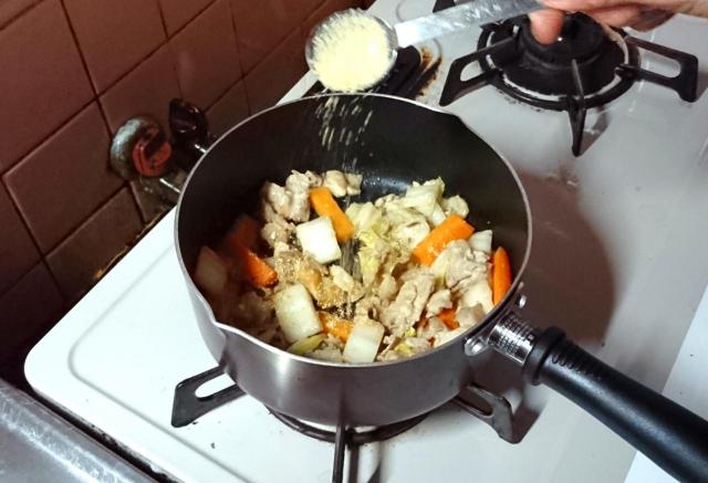 バターや味噌、鶏がらスープの素などの調味料をIN