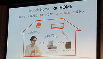 「au Home」はKDDIが7月31日に開始したサービスで、スマートフォンとネットワークカメラなどの「au HOMEデバイス」を活用し、外出先から家族や自宅の状況把握や、家電の遠隔操作などが行える。「au HOMEデバイス」の購入費は別途かかるが、月額490円という手頃な価格でホームIoT環境を実現できる。