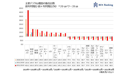 そのほか、1年目は売り上げを伸ばしたものの、今年は失速したカテゴリーも多い。グラフィックボードは1年目に141.7%だったものの、今年は98.0%と勢いを維持できていない。またノートPCも1年目は121.3%と伸びたが、今年は89.1%と2桁割れだ。いずれもコロナ前との比較ではまだプラス圏だが、今後さらに失速する恐れもある。早期に需要を先食いして勢いが続かなかった面もあるほか、折からの半導体や部材の不足、物流の停滞などから品不足が起きていることも影響しているようだ。これらもコロナ禍の影響といえる。(BCN・道越一郎)