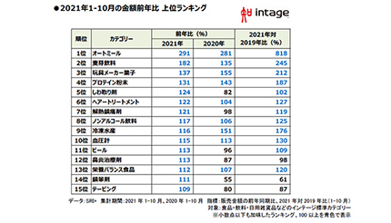 インテージは12月8日、日用消費財の中で何がより売れたかを推定販売金額の伸びから振り返る「2021年、売れたものランキング」を発表した。新型コロナウイルスで生活が激変した2020年だが、その影響を引きずりつつも人々の行動変容により2021年は新たなトレンドが見えてきた。調査は、全国約6000店舗から収集している小売店販売データ「SRI+R(全国小売店パネル調査)」をもとに実施。2021年10月までのデータを使用し集計した。