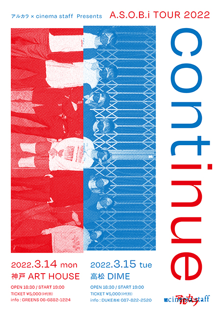 アルカラとcinema staffの、3年ぶりとなる『A.S.O.B.i TOUR』が開催決定。今回は、3月14日(月)兵庫・ART HOUSE、3月15日(火)香川・DIMEの2会場でのショートツアーとなっている。