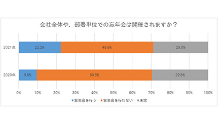 2021年の調査では、「忘年会を行う」という回答は22.2%で、「忘年会を行わない」が48.8%、「未定」は29.0%となった。2020年の調査では、忘年会を「行う」が9.6%、「行わない」が60.8%、「未定」が29.6%だったことから、2020年と比較して2021年は忘年会の開催に前向きであることがうかがえる。