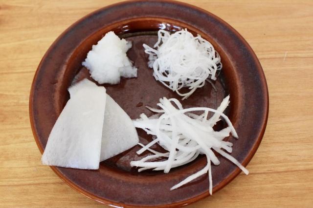 左上から時計回りに、おろし、細切り、太切り、スライスです。