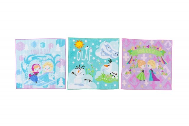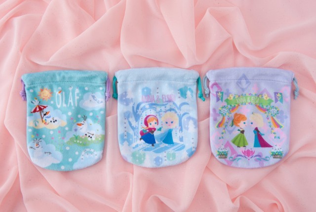 憧れの夏を満喫するオラフや、スケートを楽しむアナとエルサなど、かわいい絵柄がプリントされたきんちゃく3枚セット。