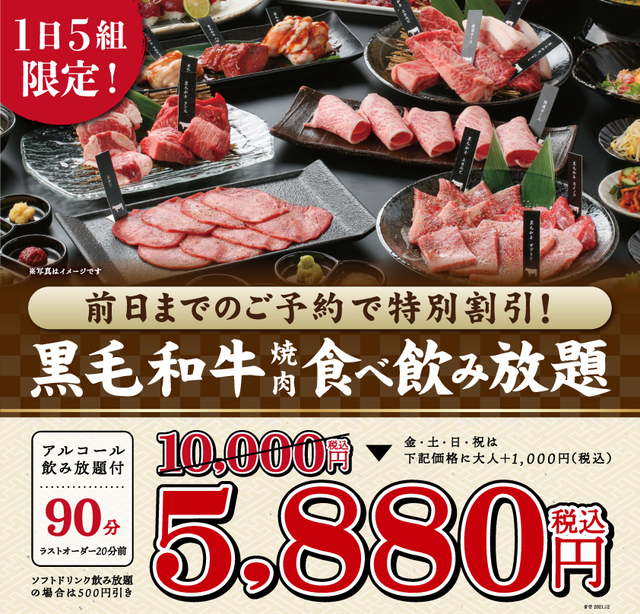 同コースは先着5組限定の利用となっており、前日までに予約をすると通常価格お一人10,000円のところ、5,880円で黒毛和牛を含む70種以上のメニューが食べ飲み放題になります。