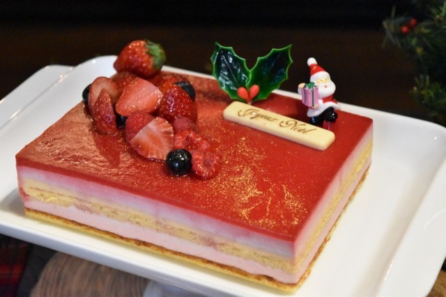 きめの細かいスポンジケーキと、ベリーのムースとバニラのムースの味わいが重なり合った優しい味わいのケーキ。ベリーのソースや果実などが食後もサッパリ。サイズは16×11.5cm。