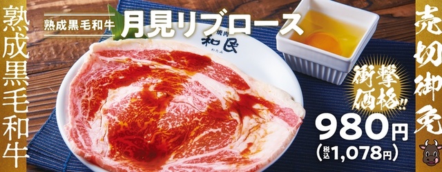 焼肉チェーン『焼肉の和民』では、2021年12月1日(金)から2022年1月31日(月)まで、販売数量限定で特選メニュー「熟成黒毛和牛月見リブロース」を特別価格の税込1,078円で販売しています。