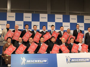 11月29日(火)の発表パーティで壇上にならんだ3つ星シェフたち。ほぼ和食。