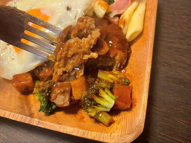 ハンバーグはもちろん、ベーコンとほうれん草のチーズソースペンネ、味付けコーンブロッコリーやポテトが入ったセットです。