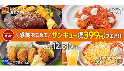 すかいらーくレストランツは12月16日~31日の期間、同社が運営するファミリーレストラン「ガスト」全店において、人気メニューを特別価格の399円で提供する「サンキュー(税込399円)」フェアを開催する。