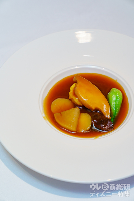 今回は、海鮮料理の「鮑と帆立貝の紹興酒と鎮江酢煮込み」と、お肉料理の「紹興酒香る牛ロース肉のソテー 温野菜添え」をいただいてきました。