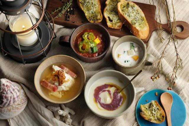 4種類のスープメニュー。「具沢山のミネストローネ」:トマトにゴーヤー、黄色の人参などカラフルな野菜がたっぷりのスープ/「ヒバーチ香るクラムチャウダー」:島胡椒と呼ばれる沖縄のスパイスをあわせた、海鮮の旨味たっぷりのチャウダー/「ゆし豆腐のコンソメスープ」:沖縄のふわふわの豆腐“ゆし豆腐”に厚切りベーコンを合わせた優しい塩味のスープ/「紅芋とカリフラワーのポタージュ」:真っ白なカリフラワーに、色鮮やかな紅芋を合わせたクリーミーなポタージュ