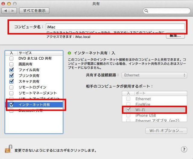 設定画面が表示されるので「サービス」から「インターネット接続」にチェック。そして「相手のコンピュータが使用するポート」から「Wi-Fi」にチェックを入れます。最後に「コンピュータ名」にわかりやすい名称を入力します。これで設定は完了です。