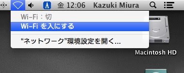 まず、Macが有線LAN接続されていることを確認。そして無線LAN接続を有効にします。