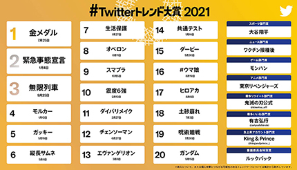 「#Twitterトレンド大賞 2021」の1位は「金メダル」で、「緊急事態宣言」「無限列車」がそれに続いた。