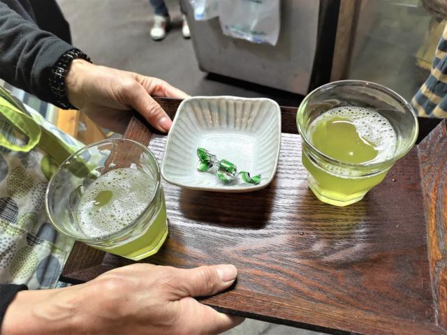 店頭で試飲させていただきました。ベルガモットで香り付けした緑茶は、香りは紅茶なのに味は緑茶という新感覚のお茶。さわやかな味わいで子供にも飲みやすかったようで、ふだん緑茶をあまり飲まない長男も全部飲み干していました。
