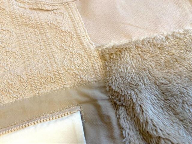 身の回りにあるいろいろなものを合体させて遊ぶ人気コーナーとコラボしたトップスは、「ぽこぽこ」のニット素材や「しゃかしゃか」のナイロン素材などががっしゃんと組み合わされたもの。