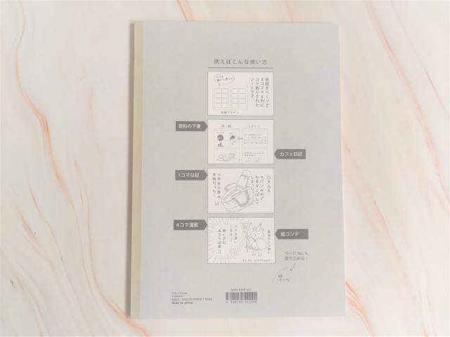 裏表紙に「例えばこんな使い方」というものが紹介されています。4コマ漫画を描くのにはもちろん、資料の下書き、食べ歩き日記など、さまざまな使い方ができるので、オリジナルノートが完成しますよ。子育て中のママなら、育児日記に使えそう!