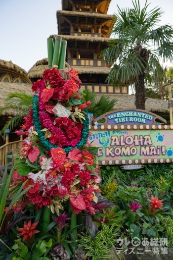 スティッチが登場する、「 魅惑のチキルーム:スティッチ・プレゼンツ “アロハ・エ・コモ・マイ!”」前には、南国風のクリスマスデコレーションも。