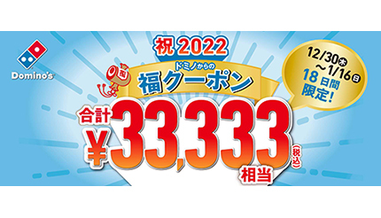 ドミノ・ピザは、2021年12月30日から22年1月16日までの18日間限定で、合計3万3333円相当がお得になる「福クーポン」を提供する。