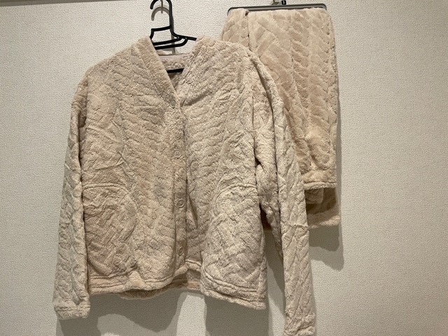 ふわふわ、もこもこの素材が特徴的なラウンジセットです。立体的なケーブル編みのデザインで、おしゃれな印象です。