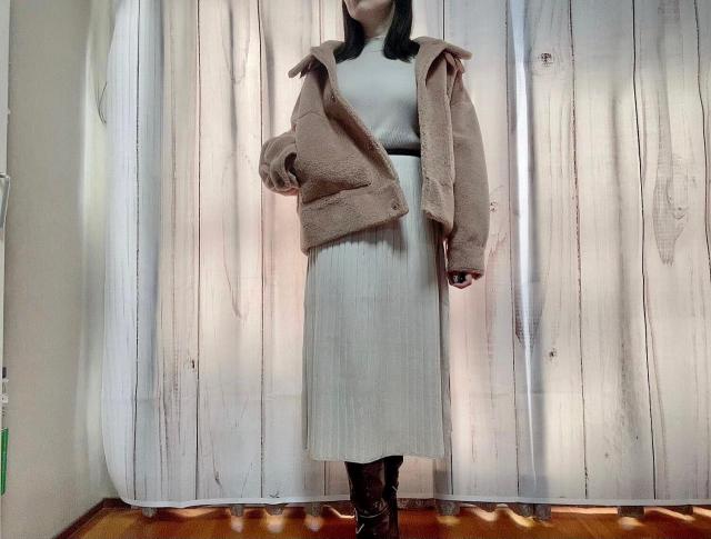 今回は、ヒールロングブーツに、エコムートンジャケットを合わせてカジュアルダウンしてみました。
