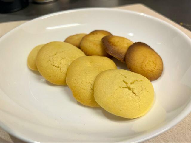 一方、説明書きにある時間の長い方で焼いてみると、こんがりきつね色のクッキーに。大きさも若干ではありますが小さめになりました。こちらはいかにもサクサクな手触りです。