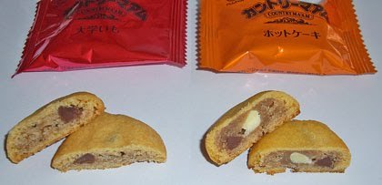 まず注目したいのは、今回僕がここにレポートしようと思ったきっかけの一つでもあるんですが、ホットケーキも大学いもも料理だということです。同じ不二家では「ルック」チョコレートがキャラメルマキアートなどの飲み物やアイスクリームの味をかなりの頻度で出していて相当アグレッシブなのですが、カントリーマアムはルックなどに比べると今までそういう動きは目立たなかった気がします。