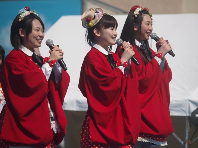 そしてこの日対バンしたのは、東北のアイドルたち。まずは青森から来た大看板、りんご娘!何度となくメンバーチェンジを繰り返しながらも存続しているグループで、以前のUMUアワードレポート [ https://ure.pia.co.jp/articles/-/5651 ] でも取り上げさせていただきました。その時には在籍していたジョナゴールドさんが2012年末に卒業。ルックス、実力、キャリアを兼ね備えた逸材だっただけに非常に惜しまれますが…それでも現在の3人、がんばっています!