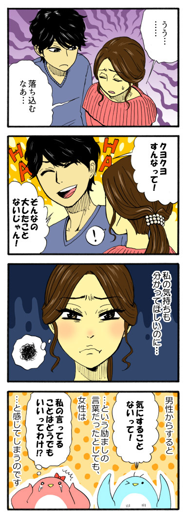 男性からすると「気にすることないよ!」という励ましの意味だったとしても、言われた女性は「私の言っていることはどうでもいいってこと⁉」と解釈してしまったり、自分の思いを無視された気になるのです。