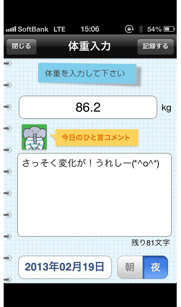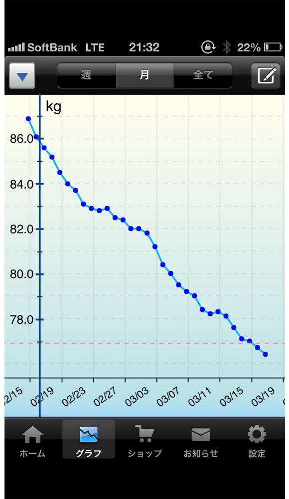 食生活を改善してトレーニングに励む毎日。目に見えてスリムになっていくので、体重を計るのが楽しくなります。体重計測に使ったのがこのアプリ。