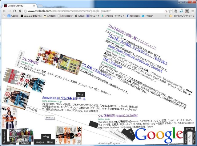 「Google Gravity」で「I'm Feeling Lucky」で検索すると……。なんと画面が崩壊! でもこんな状態でもちゃんと調べられるんですよ。検索結果も崩壊したままですけど……。