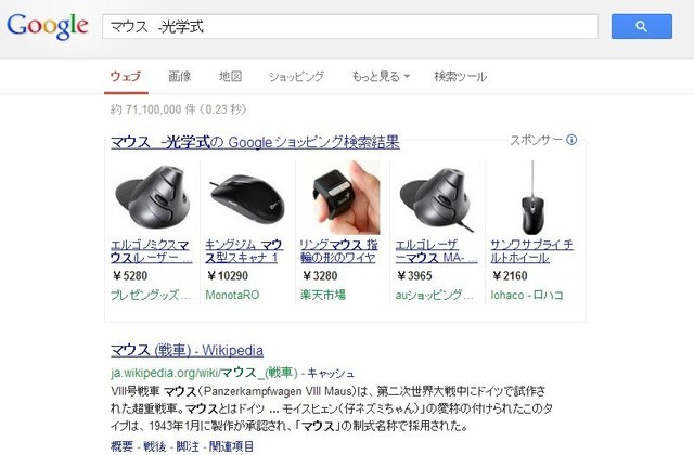 『○○○○[半角スペース]-▲▲▲▲』というように2番めの検索キーワードの前に「-(マイナス)」を加えることで、2番めのキーワードを含めないという条件での検索ができます。たとえば画像は「マウス」のなかで「光学式」というキーワードを除外して検索しています。