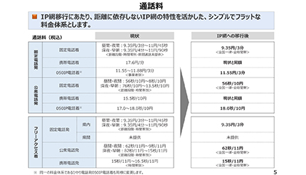 1月20日に公表した固定電話のIP網移行後のサービス詳細によると、IP網への移行後、固定電話発・固定電話着の通話料は全国一律・全時間帯で3分あたり9.35円、固定電話発・050IP電話着の通話料は3分あたり11.55円となる。固定電話発・携帯電話着は現行と同じ。
