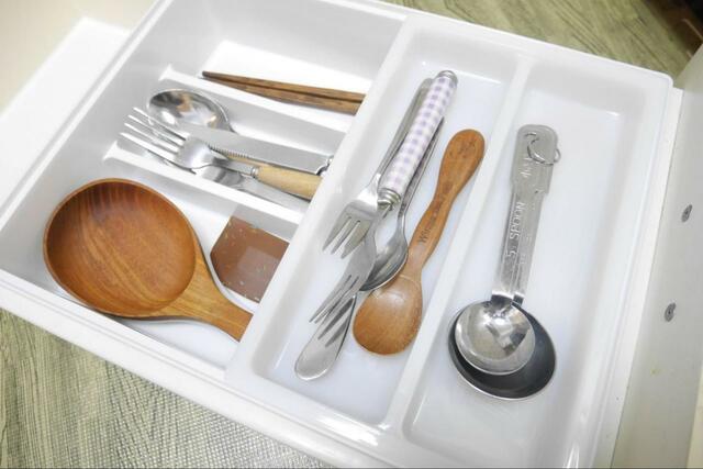 菜箸やしゃもじ、ヘラなどを入れられる長くて大きい仕切り、ティースプーンを入れられる小さい仕切りなど、細かく分かれています。