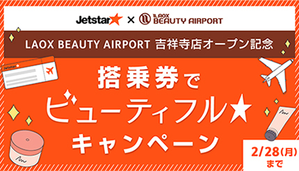 搭乗券でビューティフル★キャンペーン」は、1月1日~2月28日の期間に搭乗したジェットスター・ジャパンの搭乗券(モバイル搭乗券含む)をLAOX BEAUTY AIRPORTの対象店舗で提示すると、購入金額の10%がOFFになる。対象店舗は吉祥寺店、自由が丘店。期間中、各店舗でひとりにつき1回のみ利用可。