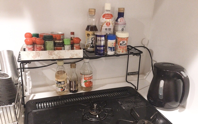 キッチンの周りに油やお醤油、お酢、スパイスなどの調味料が散乱している……。