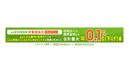 auじぶん銀行は、新規の住宅ローン契約者を対象に、au回線の契約など、所定の条件を全て満たすと最大0.1%住宅ローン金利を引き下げる「住宅ローンau金利優遇割(auモバイル優遇割+じぶんでんき優遇割)」の対象者を拡大する「住宅ローン au金利優遇割 対象者拡大キャンペーン」を3月31日まで実施している。