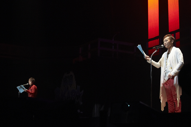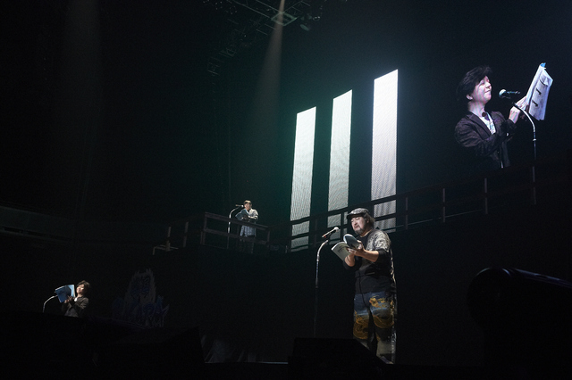 興奮冷めやらぬまま、続いてのコーナーは「戦国ドラマ絵巻」。こちらは「戦国BASARA」に登場するキャラクターの声優陣が登場し、この会場でボイスドラマを披露するというもの。「片倉小十郎(森川智之) VS 真田幸村(保志総一朗)」や「立花宗茂(稲田徹)&大友宗麟(杉山紀彰) VS 前田慶次(森田成一)」「長曾我部元親(石野竜三) VS 毛利元就(中原茂)」といった人気キャラクターによる生のやりとりに、会場のファンは大きな歓声が上がっていました。